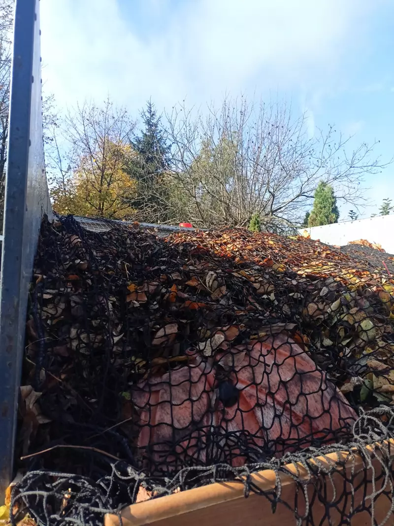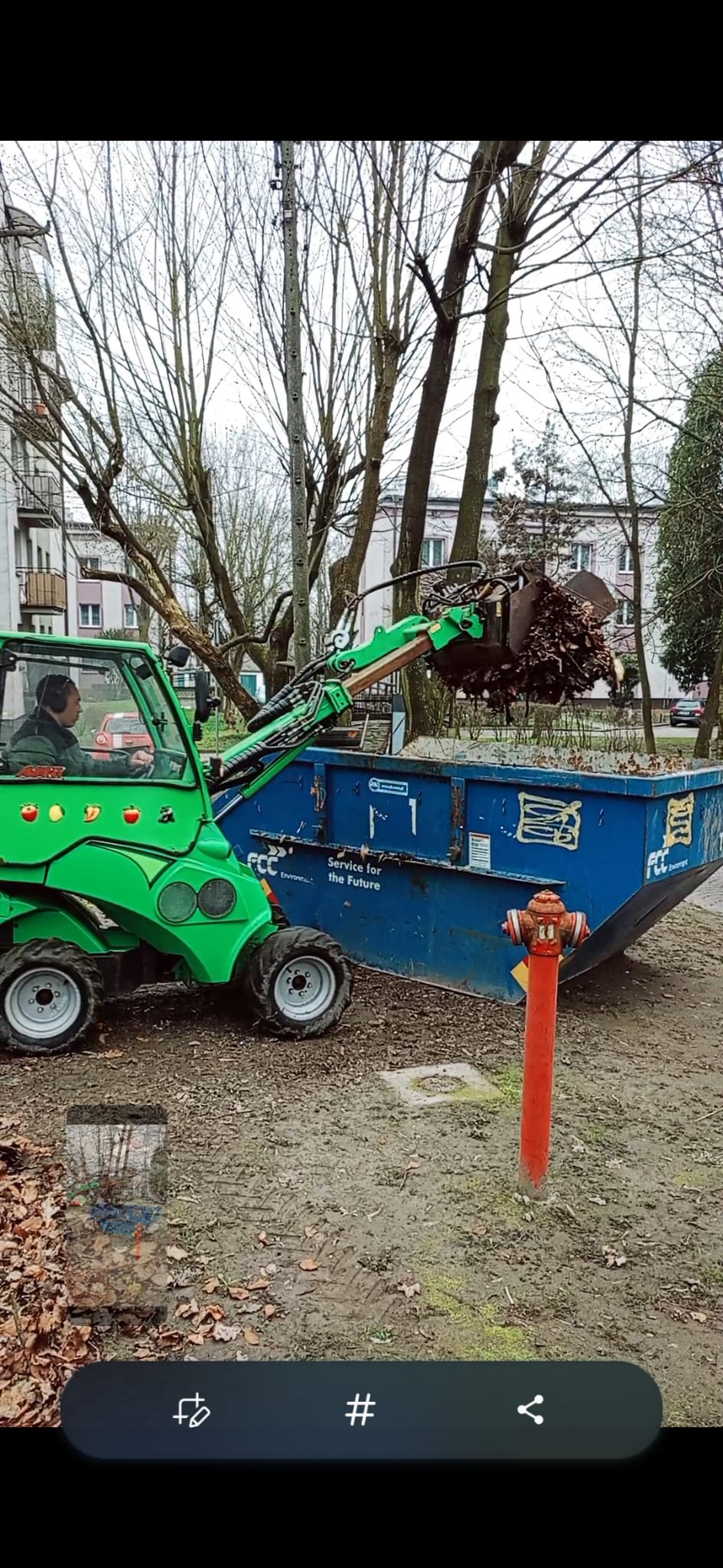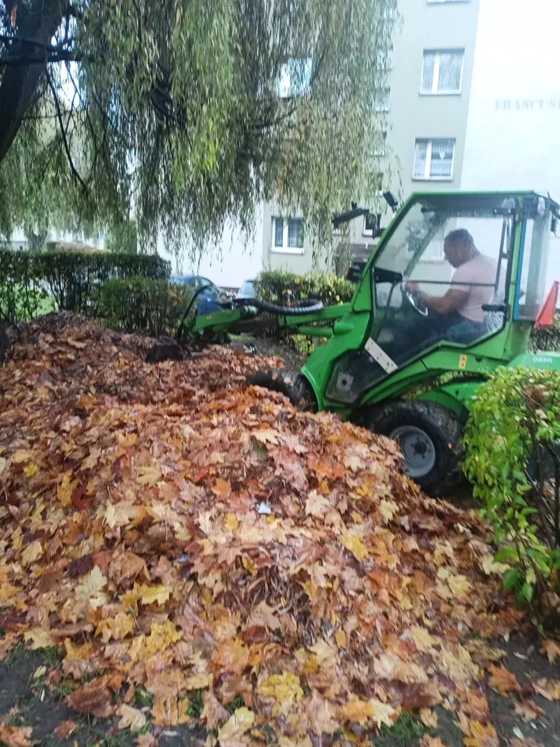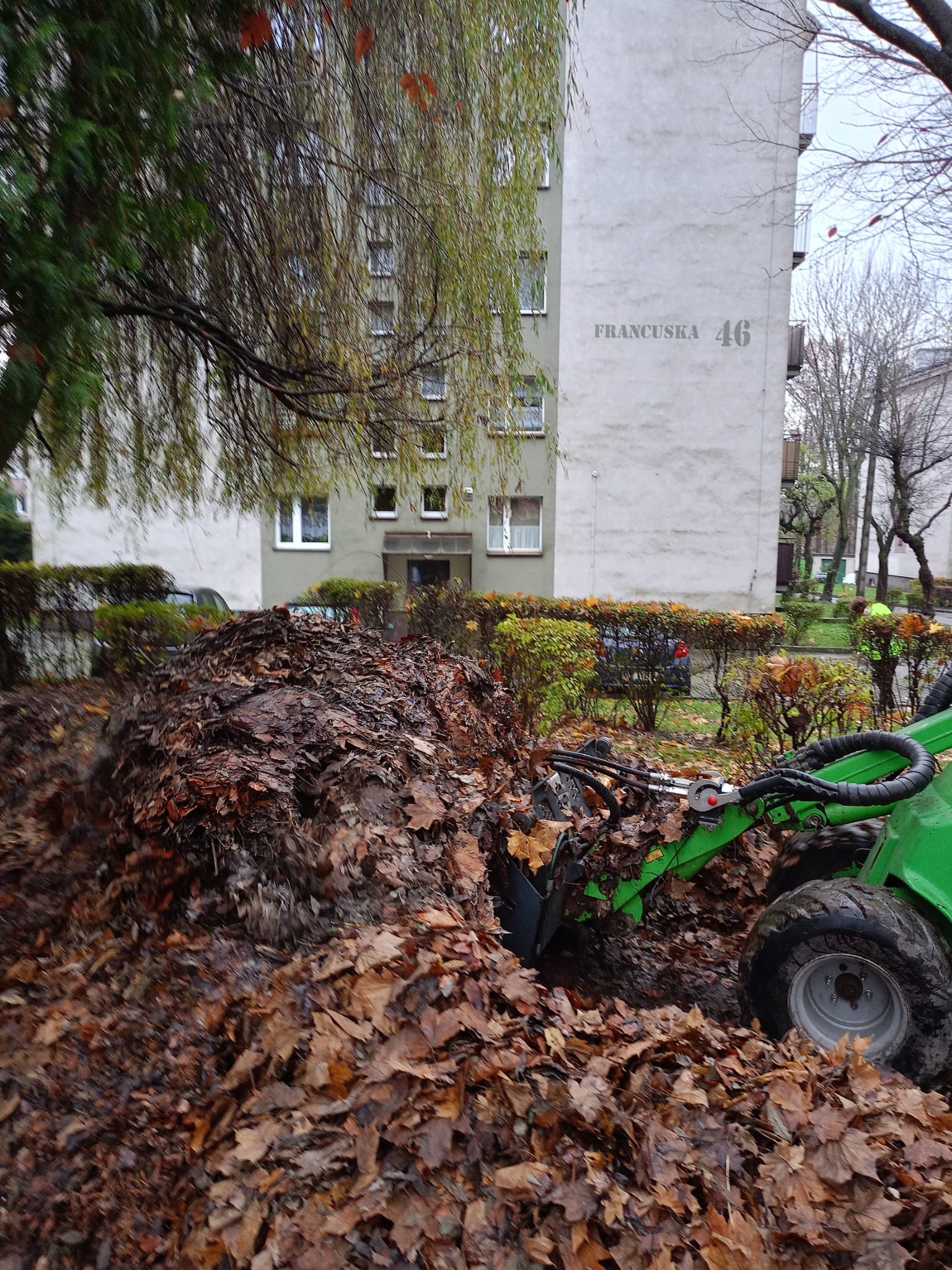 Następnie przystępujemy do ich ręcznego grabienia i załadunku. W przypadku niewielkich powierzchni prace te wykonujemy manualnie, dbając o estetykę i dokładność. Jednak przy większej ilości liści wykorzystujemy sprzęt mechaniczny – miniładowarki lub traktory z czołowym ładowaczem, które znacznie przyspieszają cały proces.